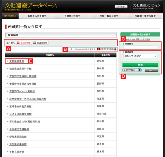 美術館、博物館、関連団体などの名称を入力し、所蔵館を絞り込むことができます。