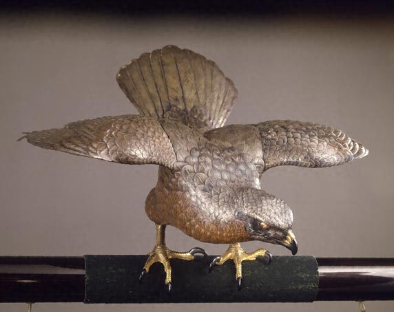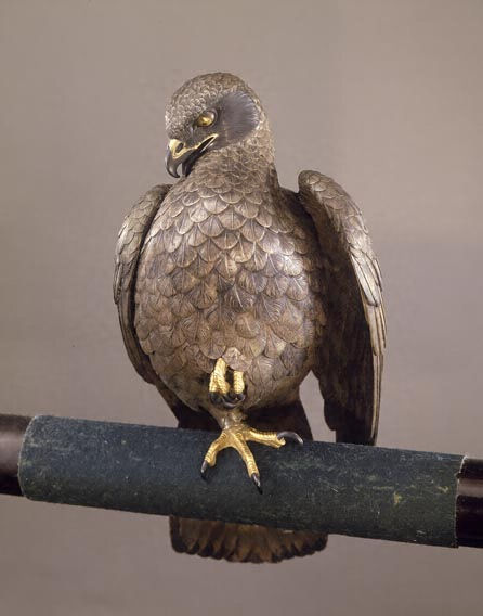 鈴木長吉はこの作品のために実際に鷹を飼って写生を繰り返し、制作に3年の歳月を費やしました。江戸時代に発達した高度な金工技術を駆使し、様々な姿の鷹をいきいきと見事に表現しています。この作品は、1893(明治26)年に開催されたシカゴ万国博覧会に出品するために制作されました。