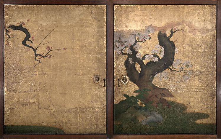 戸襖には紅梅の巨木を中心に、後方から桜を、根元には芝垣を配する。桜は梅に寄り添うように描かれ、早春から春の盛りへと季節の移り行く様子が静かに表現されている。西面の図様は一の間から二の間へ桜の枝の伸びを通じて展開している。金地に水墨で描かれている長押上の壁貼付には、手前の建物群から奥の寺院へと向かう二人の人物が描かれる。この部分は、梅や桜の咲く「やまと絵」の華やかな長押下の画面とは全く異なる趣をもって構成されている。こうした水墨の表現は二の間の、全ての長押上の小壁に共通する。