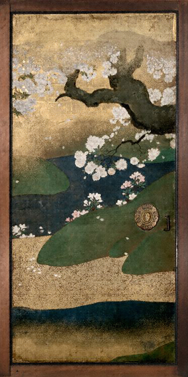 二の間南側は戸襖六面と長押上壁貼付四面からなる。東側から続く流水を受けて、画面右奥に小高い丘に立ち並ぶ桜の木々が、手前には躑躅や根笹が描かれる。桜の花びらが水面や土坡に舞い落ちており、一の間北側から二の間南側へ、早春から晩春への移り行きが表現されている。長押上貼付には画面左方に遠景の岩山、右方に近景の松や楼閣が水墨によって描かれるが、これは西側の長押上貼付と連続した画面となっている。