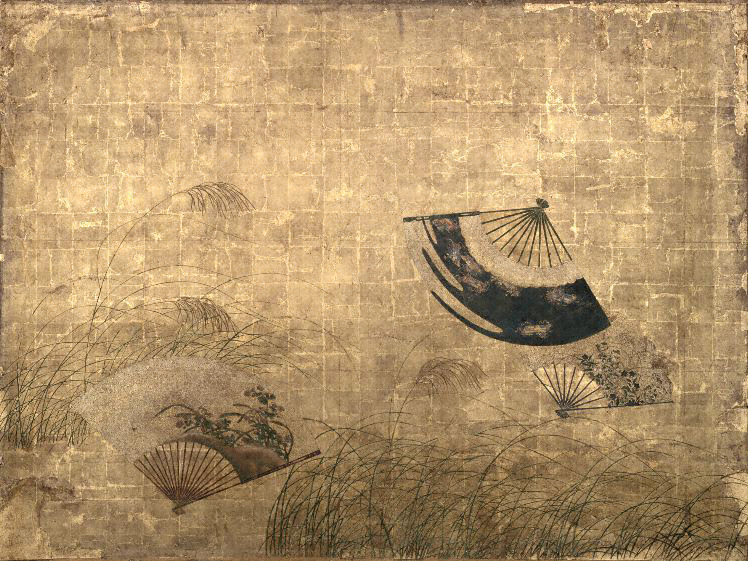 本図は隣接する帳台の間と壁で遮断されるため、長押上の上下とも壁貼付となる。菊花図は、画面左方から中央にかけて流水、右方は竹垣と菊花が描かれるが、垣根や花ともに右へいくほど数多くなり、右端ではほぼ画面いっぱいに紅白の菊花が咲き誇っている。扇面諸図は、左より、花筏図、秋草図、菊に水仙図、土坡に紅葉図、紅白躑躅図、牡丹に胡蝶図、菊花図、柴垣に松図、桃花図、山吹図の計十面である。左から二番目の花筏図のみ下向きに描かれ変化を示している。