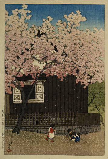 川瀬巴水(1883ー1957)は東京の生まれ。本名文治郎。荒木寛友らに絵の手ほどきを受ける。鏑木清方に入門を請うが容れられず、清方の勧めで白馬会葵橋洋画研究所で洋画を学び、岡田三郎助にも指導を受けた。明治四十三年清方に入門を許され、巴水の号を受ける。大正七年、同門の伊東深水の木版画「近江八景」を見て版画への関心を喚起され、同年渡辺庄三郎の知己を得て初めて版画を出版。創作版画運動に対して、伝統的な木版技術による新様式の開拓をめざす渡辺版画には、深水の他橋口五葉、山村耕花、名取春仙らが加わっていた。巴水は中でも写生に基づく風景版画に独自の世界を切り開いた。