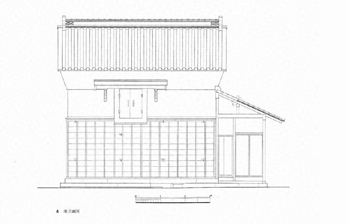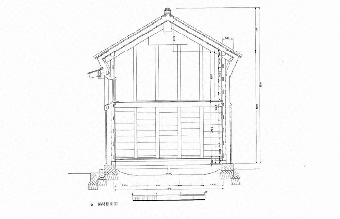 桁行5.5m、梁間4.5m、二階建、切妻造、本瓦葺、妻入り、東面
