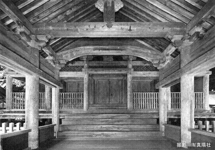 桁行五間、梁間二間、一重、入母屋造、正面一間通り庇付、こけら葺