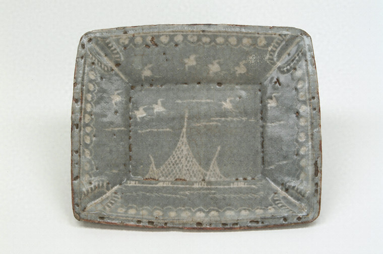 型打ちにより長方形に整え、体部は斜めに開いた額の形状をもつ鉢で、額皿ともいわれる。全面に鉄化粧をし、内面には刻線により文様を施す。底部の4ヶ所に付けられた半円柱状の足を残して長石釉を施す。文様は、口縁部に列点文と波状文の縁取り、見込みには千鳥と網干を表している。長石釉は白く濁り、鉄化粧部分は灰黒色を呈している。大平または大萱の窯で焼かれたものと考えられる。