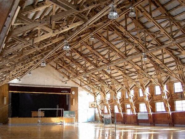 1953年に全焼した校舎と共に翌年再建。屋根は切妻造鉄板葺。外壁は腰を鎧下見板張、上部をモルタル塗りとし、上下2段に窓を開く。天井の2ヒンジ・トラスの木造小屋組の構造が美しい。内部見学要問合せ。