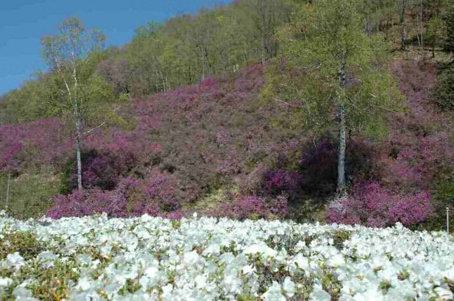 ・温根湯温泉街から、無加川に沿って東へ約500メートルの丘陵斜面に7万株、28万本ものエゾムラサキツツジの純群落があり、5月上旬には山肌一面が赤紫色に変わり、遊歩道に一歩踏み込めば、匂いたつような甘い香りに包まれ、天候や光線の加減によっては淡いピンク色や濃い紫色など多彩な表情も見せてくれます。