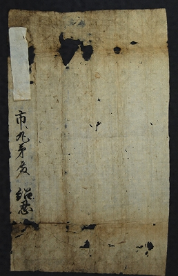 天正6年(1578)11月に大友氏と島津氏との間で戦われた日向高城・耳川の合戦で戦死した市丸右京亮の跡目を息子の市丸弟に譲りの旨に任せて領掌することを田原紹忍(親賢)が認めた書 状。紹忍は、高城・耳川の合戦で大友軍の総指揮をとったが、大敗し、戦死をうわさされたものの1ヶ月後に無事生還した。本書状は、紹忍が生還した天正7年3月18日 に出されたもので、切封の跡や包紙が残るなど、文書の原形をよくとどめている。
