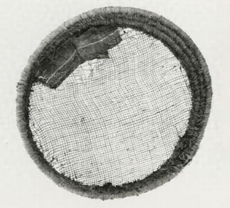直径40.0cm 高さ6.0cm。網目の大きさ0.4cm平方。枠は竹 藁。 網は麻紐を材料としている。