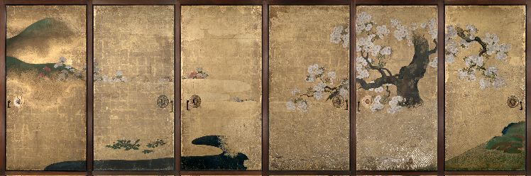 右方の芝垣の背後には桜が描かれる。画面中央から金雲の隙間に紅白の躑躅の花が見え隠れしながら左方奥の遠山へと続く。右方の芝垣と土坡は一の間西側戸襖、左方の遠山は南側の戸襖の図様へと連続した図様を見せており、一の間からこの間へと春の情景が展開していることが分かる。長押上小壁貼付は水墨によって右方の岩肌に囲まれた楼閣と家並から、帆船の浮かぶ水景へと移り、遠景には堤防や石橋を描く。この水景も二の間の南側の図様と連続しており、西側から南側の長押上の壁貼付へ向けて緩やかな山水図を展開する。