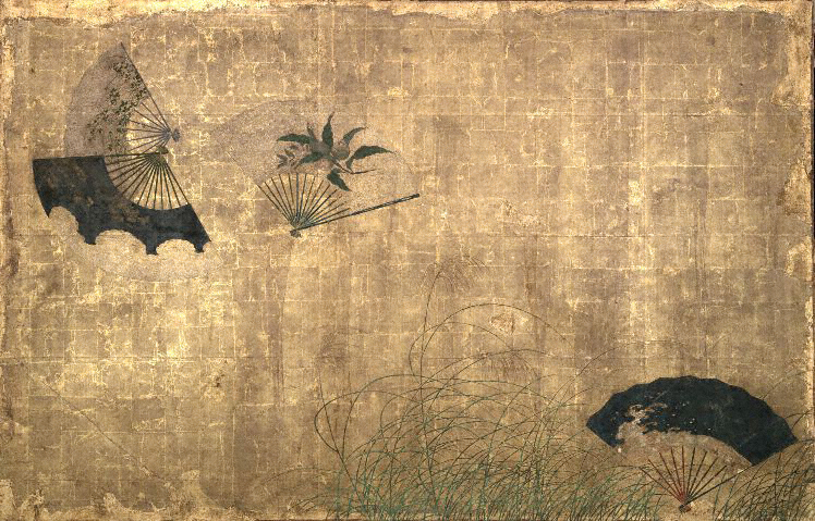 菊花図は、画面左方に土坡を背景として大小の垣根と白菊、紅菊を配し、中央部には流水を大きく描く。この部分では花の割合は少なくなっており、花自体も小ぶりである。右方には、柴垣に紅白の菊が配されている。右部分の花が柴垣とともに右からの風になびいているなど、全体に変化にとむ構成となる。扇面諸図は、左より、菊薄図(泥絵)、薄に萩図、桃図、波涛図、枯木に宿鳥図(墨画)、桔梗に薄図、雷文図、山水図(墨画)、墨竹図、楼閣山水図(墨画)、柴垣に蔦図、木瓜に小禽図、楼閣山水図(墨画)を描く計十三面である。