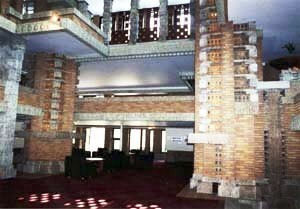 F.L.ライト設計。車寄,ホワイエと両側のラウンジ,ロビーを保存。水平性の強調,床高の微妙な変化や,彫刻した大谷石,スクラッチ煉瓦,透かしテラコッタによる幾何学装飾など,ライトの設計手法を良く表す。移築時に主構造をSRC造と鉄骨造に改めた。