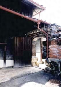 主屋西南端,玄関脇に発し西外塀に突き当たる塀で,玄関前庭と台所前裏庭方面とを区画する。庭塀と同様,自然石の石積基礎の上に築かれた,煉瓦1枚半厚,イギリス積の煉瓦塀で,小屋根には左瓦を用いる。玄関寄りを一段高くし櫛形アーチの勝手門を開ける。