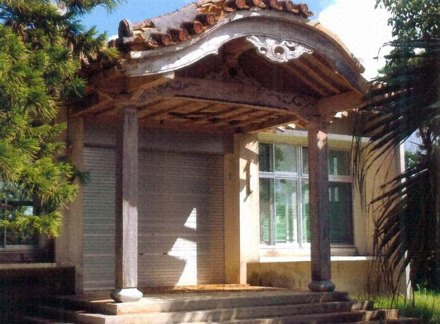 唐破風造の吹放ち玄関で,正面柱間3.6m。琉球赤瓦葺とする。角柱上の組物は大斗,実肘木で,虹梁を受け,板蟇股と斗,実肘木で棟木を受ける。破風は拝みと起りの中程に茨をつけ,拝懸魚を飾り,竿縁天井とする。沖縄における伝統意匠の数少ない遺構である。