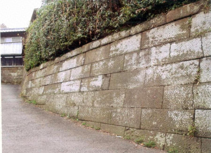 敷地の東辺をなす石垣で,谷戸の下手側にあたり,当家に至る道路の擁壁である。当地に産した砂岩系の鎌倉石を整層切石積とし,延長40m。見付高さ30cmの石を9石まで積み,上端を笠石で押さえる。上部は生垣とし良好な宅地景観を呈す。
