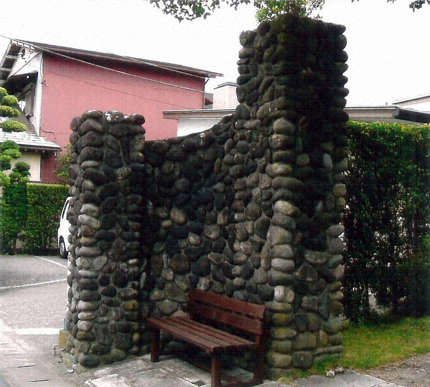 主屋の前方に位置し,前面道路境に北面して立つ。玉石練積で,高さ3.2m,間口2.8mとし,角状の柱が一対立ち,両側に袖塀を円弧状に前方へ延ばし柱を立てる。鉄扉を失うが,吊り金具が現在も残る。主屋及び前庭に相応しい重厚なつくりで,表構えを形成。