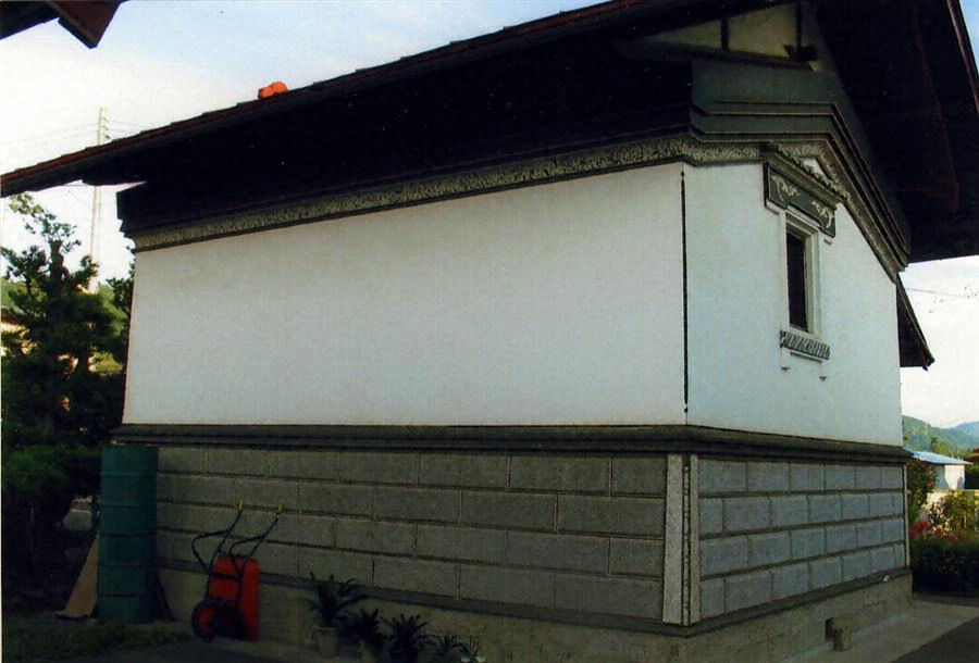 南面する敷地の東南、出入口脇の少し奥に南を正面として建つ。桁行3間半、梁間3間で、切妻造鉄板葺とする平入の土蔵造2階建である。外壁は漆喰塗で鉢巻を黒漆喰塗とし、窓の上部に瓦庇風の装飾を付け、虹梁状の鏝絵を施すなど、効果的な意匠になる。
