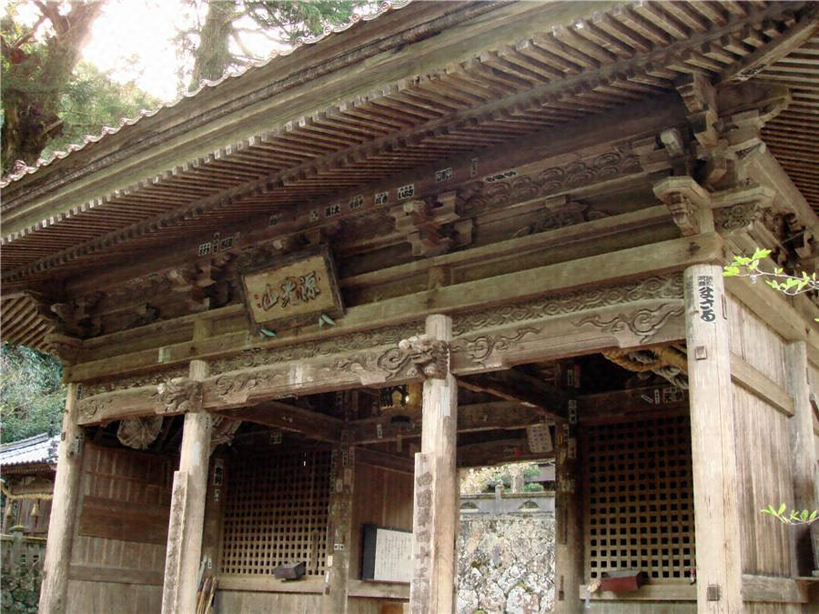 本堂の前方、境内中段の平地に位置し、南面して建つ。3間1戸八脚門で、入母屋造、桟瓦葺とする。出組で二軒繁垂木。正面は頭貫を全て虹梁形とし、欄間や支輪板に雲紋を彫り込み、大棟は両端に鯱を配し、側板は波や龍に型取るなど、意匠、技術ともに優秀。