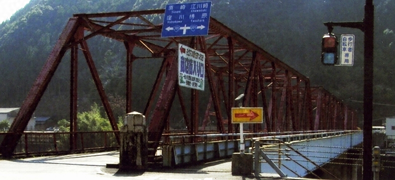 梼原川の最下流部、四万十川との合流点近くに架かる道路橋。150ftのワーレントラスを用いて築かれた橋長138m、幅員4.6mの鋼製3連トラス橋で、花崗岩製の親柱には幾何学的な装飾をあしらう。梼原川に架かる最大の近代橋梁。