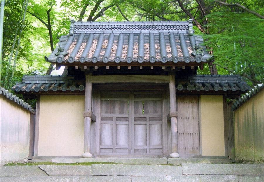 開山堂の正面に建つ四脚門。切妻造本瓦葺で、両側面に袖塀を設け、西に潜りを穿つ。円柱で、三斗組。妻は虹梁大瓶束とし、一軒疎垂木。本柱と控柱は腰長押や頭貫、台輪で固め、長押上に菱文様を彫った板壁を嵌める。扉は桟唐戸両開。手堅い意匠になる四脚門。