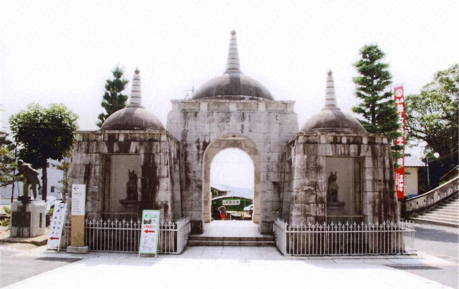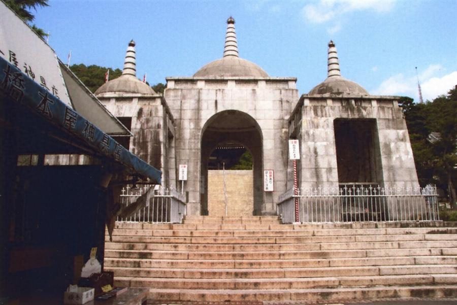 参道正面に建つ。花崗岩切石貼のRC造。中央に方4.2m、四隅に方3.9mの矩形平面を張り出す独特の構成になり、各々にドーム状の屋根を載せ、相輪を立てる。中央棟をアーチ形に開け通路とし、他には仁王像等を安置。伝統的な社頭景観において異彩を放つ。