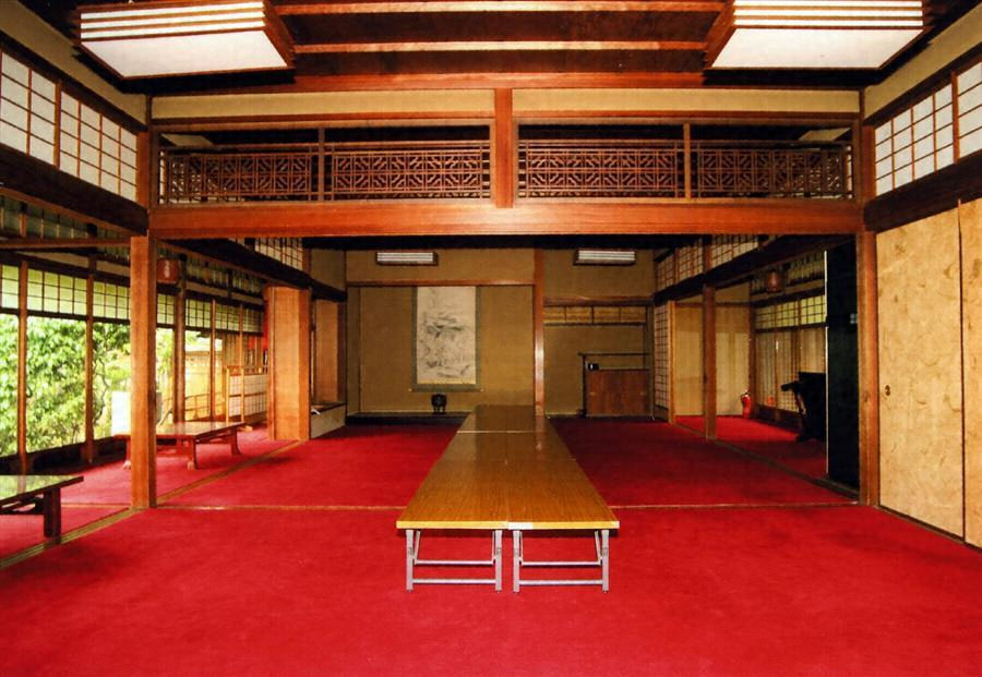 敷地西北に位置し、南北を庭園に囲まれる。東西棟の入母屋造桟瓦葺、背面に入母屋屋根を出し、周囲に銅板庇をめぐらす。十六畳の大広間と次の間を東西に並べ、三方に畳縁をまわし、角座敷を付設。厳選された良材が使われ、座敷構えや繊細な欄間など見応えがある。