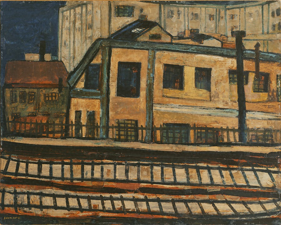 「歩いてゐて好ましい建物に打ちあたることは日常の習慣になつてゐる。その時僕は荒々しい数本の線でその建物を失敬してくるだらう。」松本竣介は短い生涯で数多くの都会風景を描き残した。その中でも建物は重要なモチーフとして繰り返し登場する。東京の有楽町を描いたものといわれている。建物が林立し当時から繁華街であった有楽町。そんな風景に惹かれ、ここで竣介は建物や線路の線を「失敬」してきて、太い線でぐいぐいと描いている。「竝んでゐる建物は僕にとつて余り立派なものである必要はない。安つぽい建物でも幾本かの立派な線を必ず持つてゐるものである。……何よりも建物の立つてゐるといふことが僕にとつて最も大きな魅惑なのだ。」