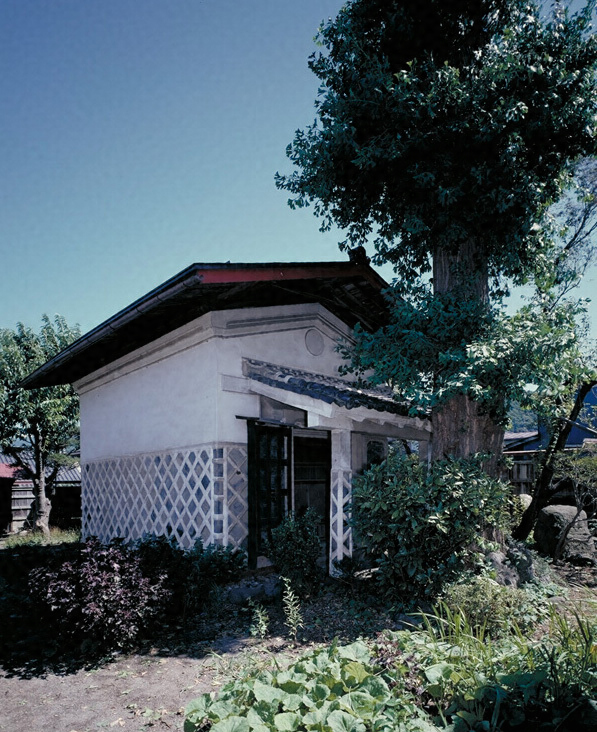 中山道塩尻宿に残る旅篭屋。道路に面した総二階建の主屋のうしろに土蔵造の文庫が建つ。幕末における宿場の雰囲気を示す好例である。