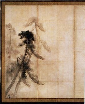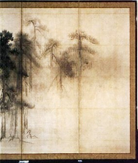 桃山時代絵画を代表する一作。狩野永徳と併称される長谷川等伯の筆。水墨の濃淡のみを用い、荒々しい筆致によって一気呵成に仕上げたような画面からは、霧に包まれた松林の雰囲気が見事に表現され尽くしている。わが国水墨画を代表する遺品のひとつである。六曲屏風、一双。各156×347cm。