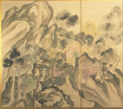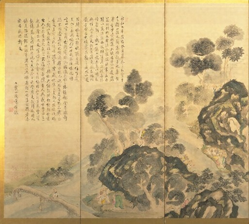 晋の時代の故事に取材し、春の「蘭亭曲水」と秋の「龍山勝会」とを両隻に描き分ける屏風である。