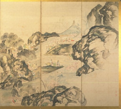 「蘭亭曲水図」は、流觴の曲水を山間の巨岩を縫う渓流として表し、群賢を自然景の中に隠見させる。屈曲する流水の動勢と人々の楽しげな様子に、この主題に対する新鮮な解釈が見られる。「龍山勝会図」は、巨岩の重畳する龍山を近景に、河を隔てた市街を遠景に描き、両景を極端に対比させる大胆な構成によって、奥行きの深い空間を造形している。両図とも、岩塊と余白とを巧みに対照し、金碧青緑山水の形式と柔軟な筆触とを調和させ、また樹葉の彩色には濃淡の諧調をつくって、広やかな自然の把握に努めており、ことに「龍山勝会図」はすぐれた出来映えを示す。