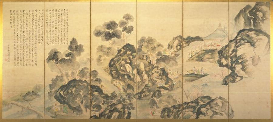 紙本著色蘭亭曲水龍山勝会図〈池大雅筆/宝暦十三年七月の年記がある/六曲屏風〉
