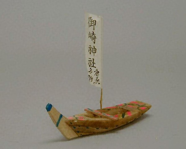 長さ26cm 宮城県唐桑町。 唐桑半島の先端にある御崎神社のお祭りで売られている郷土玩具です。御崎神社は漁業の神様として信仰されています。唐桑周辺の漁師は、遠洋漁業など長期間の漁にでる際に御崎神社に航海の安全を祈願することになっていました。さっぱ船は、海上安全のおまもりとして購入し、各家の神棚に飾りました。