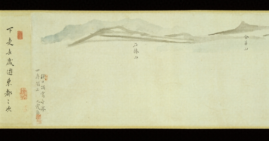 本図は寛延二年(一七四九)大雅(享保八年~安永五年/一七二三~一七七六)二十七歳の年に、金沢の藩士小堀永頼(亀山)の別邸四序閣で描いたものである。前年の陸奥旅行で見た松島の景勝を描くよう亀山に求められ、その時の印象、あるいはスケッチで補足しつつ描いたのが本図である。この年の前後、大雅は西洋画に触れたり、中国画を手本として南宗画的手法を学ぶなど、旺盛な学習意欲を示した時期である。こうした中にあって実景に触れた深い感銘をその印象にもとづきつつ描いた本図には、水墨を基調として何物にも拘束されない自由な筆使いを窺うことができ、大雅の新たな様式を開いた記念すべき作品といえよう。