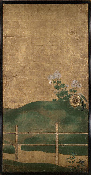 菊花図は、画面左方に土坡を背景として大小の垣根と白菊、紅菊を配し、中央部には流水を大きく描く。この部分では花の割合は少なくなっており、花自体も小ぶりである。右方には、柴垣に紅白の菊が配されている。右部分の花が柴垣とともに右からの風になびいているなど、全体に変化にとむ構成となる。扇面諸図は、左より、菊薄図(泥絵)、薄に萩図、桃図、波涛図、枯木に宿鳥図(墨画)、桔梗に薄図、雷文図、山水図(墨画)、墨竹図、楼閣山水図(墨画)、柴垣に蔦図、木瓜に小禽図、楼閣山水図(墨画)を描く計十三面である。