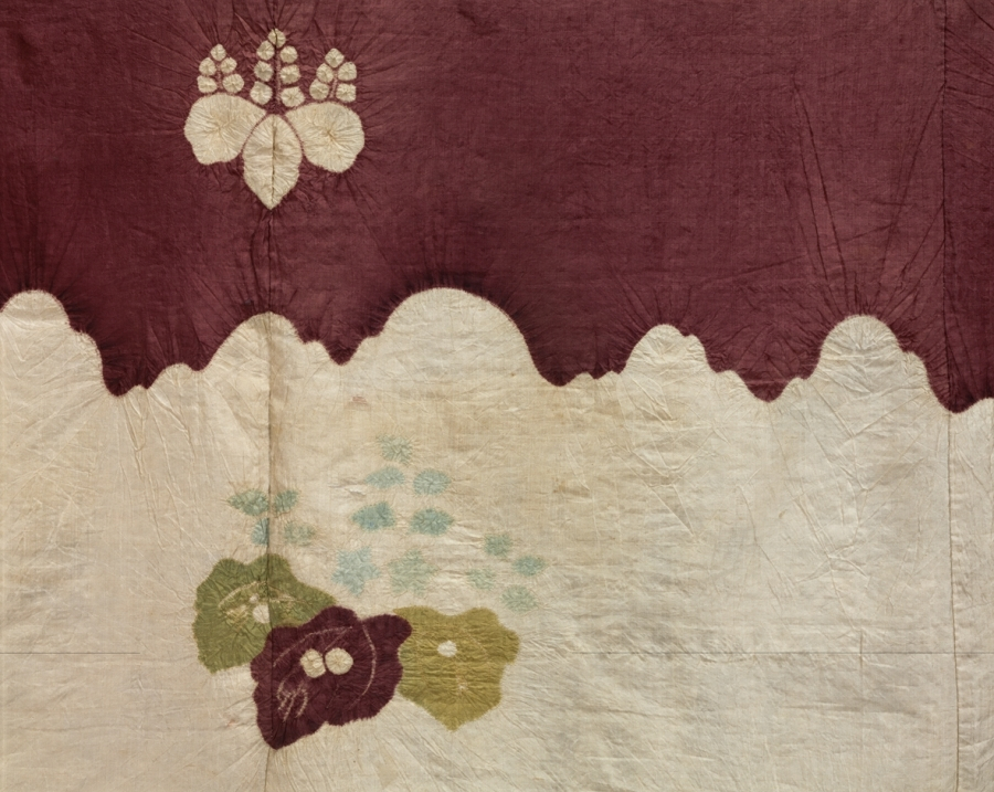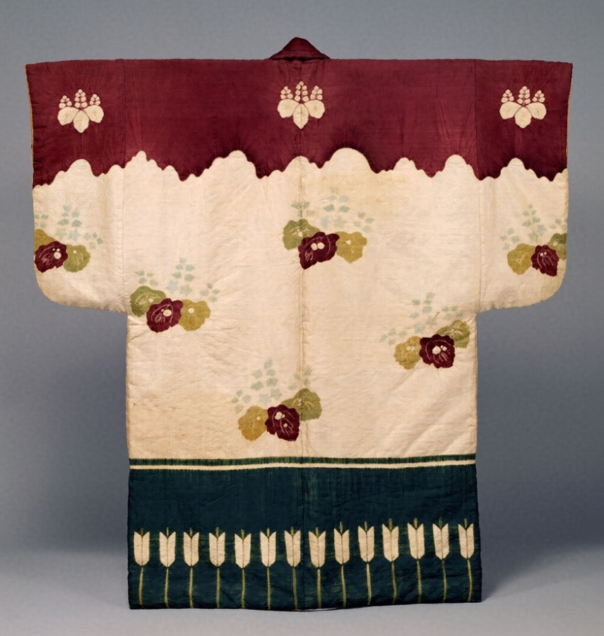紫、白、濃萌黄三段の簡明な染め色の対照を主調に、肩と裾に配された静的で均整のとれた文様に対し、胴部の動的な桐紋を配するなど、桃山時代のおおらかで洗練された感覚を示している。