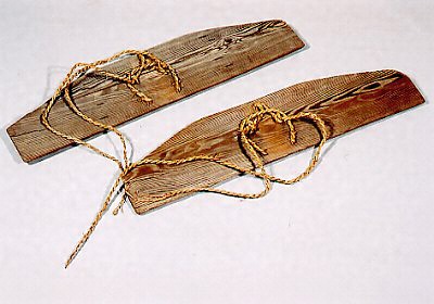 猪苗代湖周辺にのみ現存する横長型の湿田で用いた代踏み用田下駄です。杖をついて身体のバランスをとり踏み込みます。田植えが終わると、ナンバ洗いといって早苗でナンバを洗う仕事を行います。他地方の馬鍬洗いです。同型のものは、静岡県の弥生時代の農耕遺跡からも出土しています。
