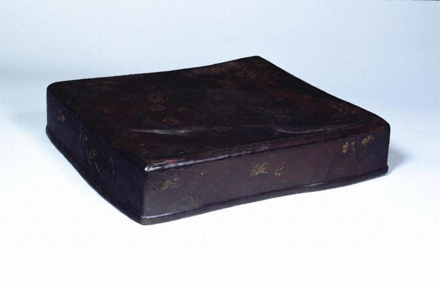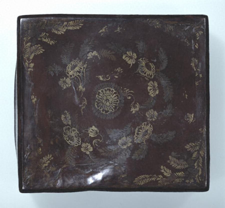 長方形で削面取りの蓋。素地は一枚革で整形する。表は中央に花文を中心にした四枚の牡丹文を配し、四隅に草花文を描き、その間に蝶を散らす。側面は尾長鳥、草花を金銀泥で表す。