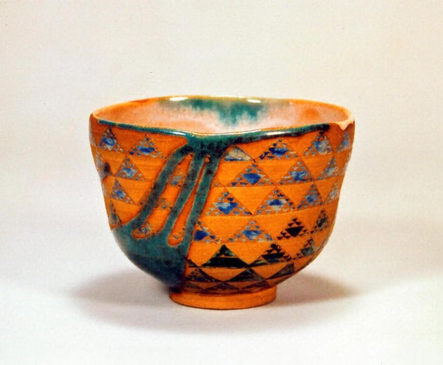 本作品は釉流れと鱗波文という幾何学文をみごとに融合させた創意に富む優品であり、筒茶碗の重要文化財・色絵金銀菱文茶碗(一組 重文 世界救世教蔵)と好対照をなす作風である。