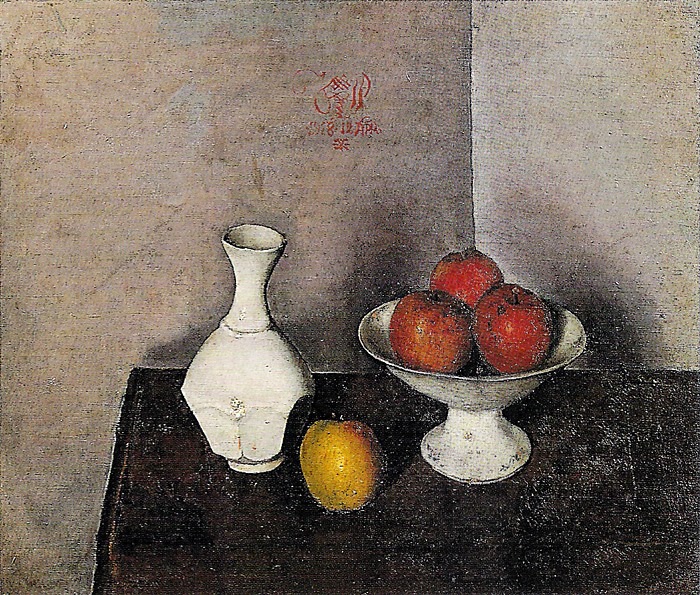静物(白き花瓶と台皿と林檎四個)