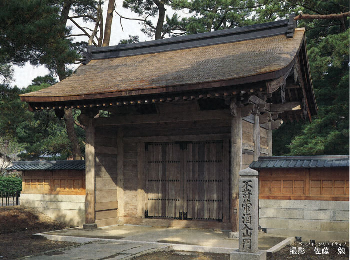 〈山門〉 三間一戸楼門、入母屋造、こけら葺、南面庇付〈総門〉 四脚門、切妻造、こけら葺