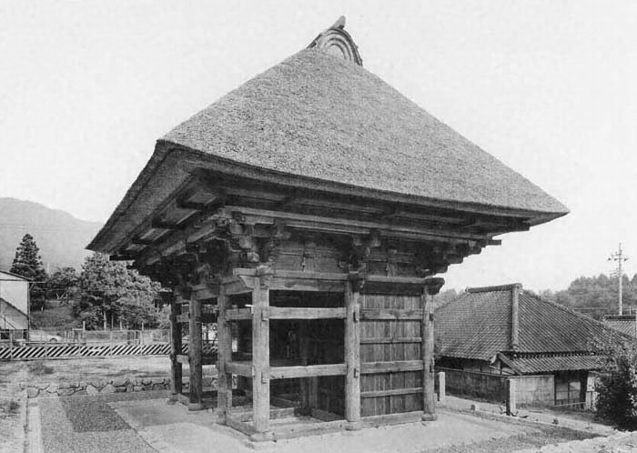 三間一戸楼門(軒以上を欠く)、寄棟造、茅葺、南面