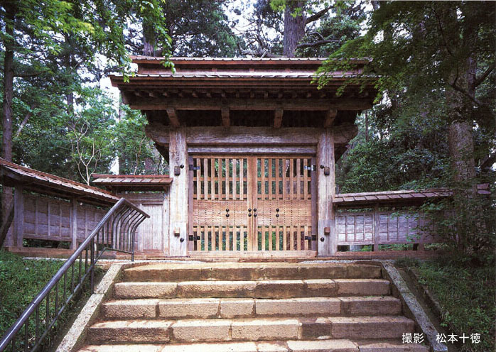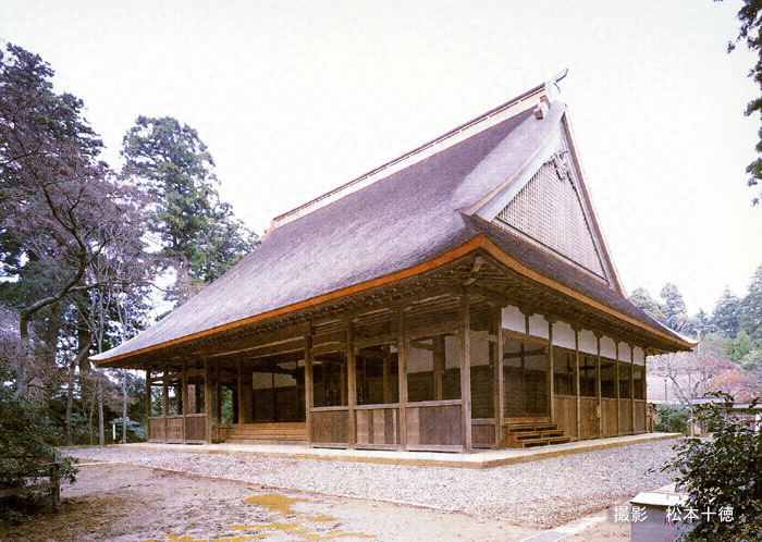 〈講堂〉 桁行26.7m、梁間16.2m、一重、入母屋造、とち葺〈総門〉 高麗門、銅板葺