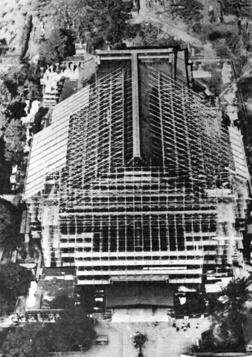 桁行十四間、梁間五間、一重、もこし付、撞木造、妻入、正面向拝三間、軒唐破風付、両側面向拝各一間、総檜皮葺