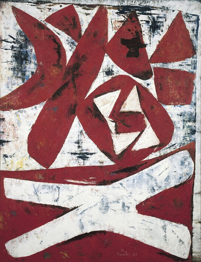 これは第4回日本国際美術展K氏賞を受賞し、斎藤が戦後再出発を果たすきっかけとなった作品である。斎藤は、「鬼は煮詰められて、乾燥され、悪魔祓いをして抜け殻になった骸がならべられ、そして、下部のほうは裏返しておきました。だから鬼はもういないかもしれません」と語り、鬼の直接的な表現であることを否定している。しかし、赤と白を基調とした画面には、鬼をめぐる様々なイメージが写し込まれている。