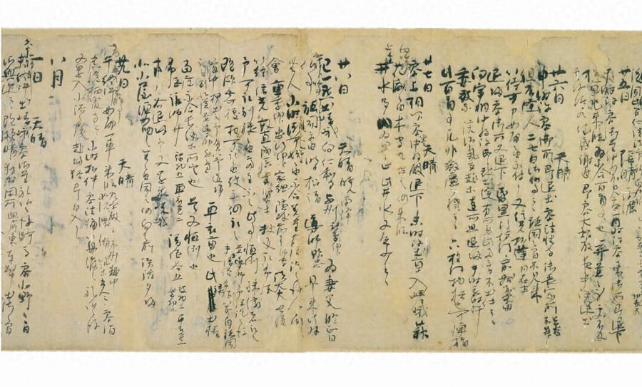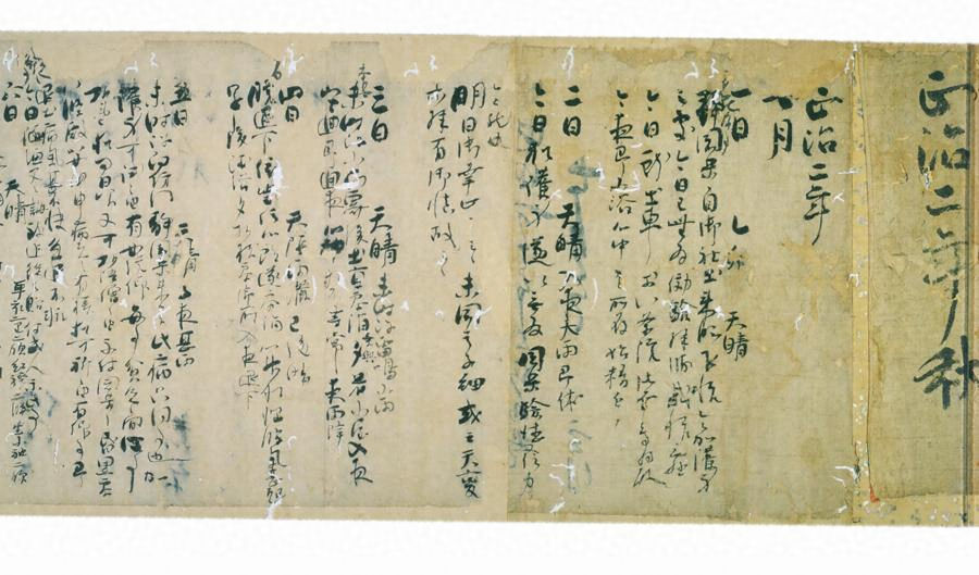 藤原定家が従四位上、左近衛権少将兼安芸権介、三十九才の時の日記で、正治二年(一二〇〇)秋七月一日より九月卅日までの記事を収める。正治二年記は現存する定家自筆本のなかでも初期に当たる。体裁は巻子装で、表紙は紺紙後補表紙、「正治二年秋」と朱筆外題があり、首に厚手楮紙の旧表紙が貼付され、定家筆と思われる「正治二年秋」の墨書外題がある。料紙は無界の楮紙で、本文は首の「正治二年」という定家筆の年紀標記から始まる。また、文中には定家自筆の墨訂正、加筆がまま見られ、後筆の墨首付を付している。本文の記事は政治史、歌道史の上で重要な事実を含み貴重である。