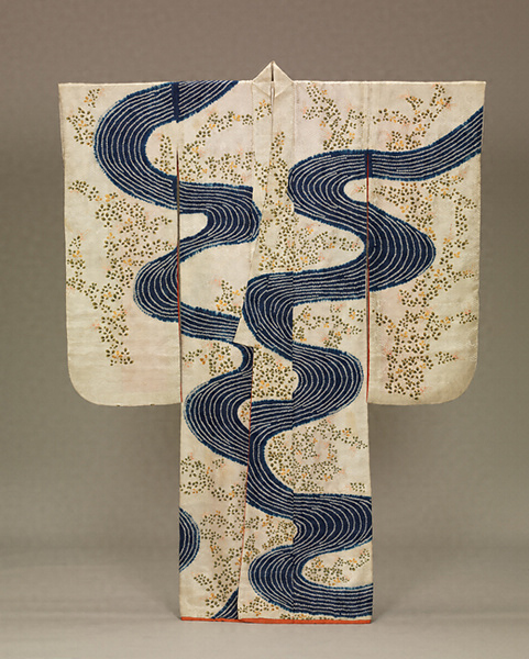 流水と萩を配した振袖。流水の立体感ある鹿の子絞りと萩の平明な型友禅染との対照的な表現は、江戸時代後期の成熟した染織技術の精華である。