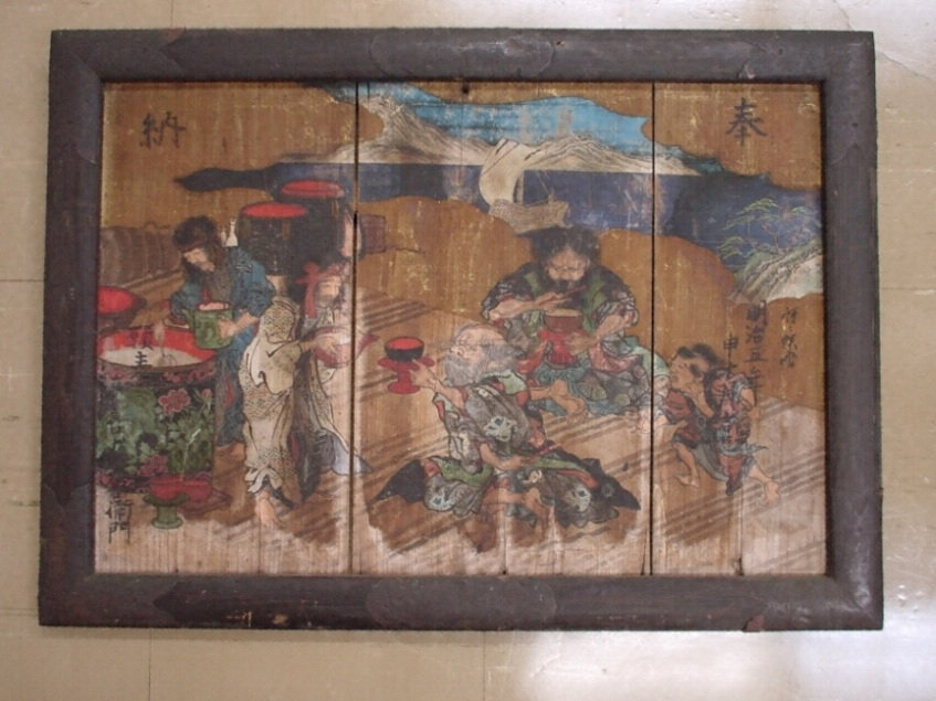 ・この絵馬は、幕末から明治初期にかけて江戸の日本画壇で活躍した河鍋暁斎(1831~1889)が、アイヌの人々の生活風俗を主題として描いた絵馬で、当時十勝場所の漁場持を努めていた福島屋杉浦嘉七の配下の船頭によって、明治5年(1872)に大津稲荷神社に奉納されたものと推測されます。