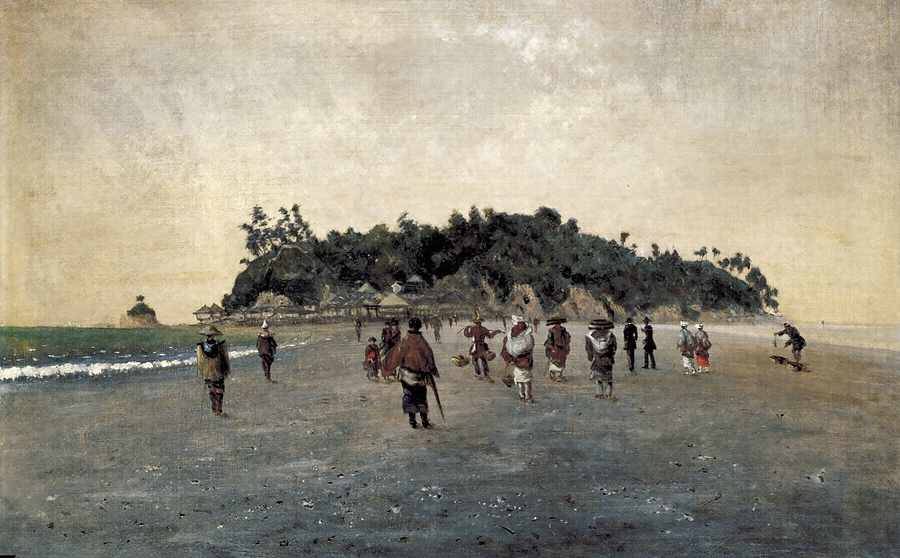 江ノ島には江戸時代から多くの人が観光に訪れていたが、1891年(明治24)に橋が架かるまで、人々は砂州を歩いて海岸から島まで渡っていた。ここには荷を運ぶ人や旅姿の人に混じって、洋装の紳士も描かれている。由一は、自らもまたそこを歩く旅人のように視点を低い位置において江ノ島を仰ぎ見て、緻密な描写で人々の姿を描いている。