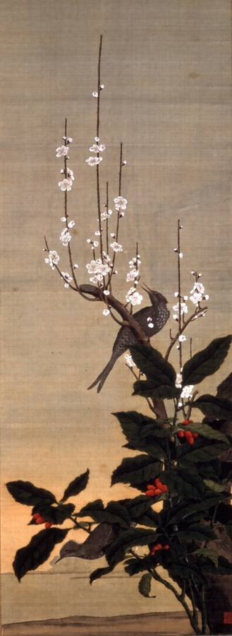 次に左右幅は、「不忍池図」の芍薬に匹敵する花鳥表現である。二幅の「花鳥図」は、ともにはるかに遠景をのぞむ水辺であり、右幅の「白梅に鵯図」は、白梅の古木と青木に二羽の鵯を、左幅の「海棠に小禽図」は海棠と八手に番らしい黒色の小禽を配している。これら花鳥画の陰影法は「唐太宗図」ほど顕著ではないが、秋田蘭画に特徴的な遠近表現がみられる。また、葉叢の緑色の部分のみに塗布されたものがあり、現在は変色している。確証はないが、前述の曙山著作の「丹青部」にアラビアゴムとある珍しい舶来のゴムが葉の艶を表現するために塗布された可能性も考えられる。
